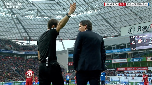In der BayArena musste der Ex-Hoffenheimer Volland bereits nach fünf Minuten nach einem Foulspiel gegen Demirbay mit glatt rot vom Platz. Dann kam es in der 51. Spielminute zu einem Foulspiel vor den Trainerbänken. Nagelsmann als „Hoffe“-Trainer war hierüber „not amused“, was wiederrum Schmidt auf den Plan rief.