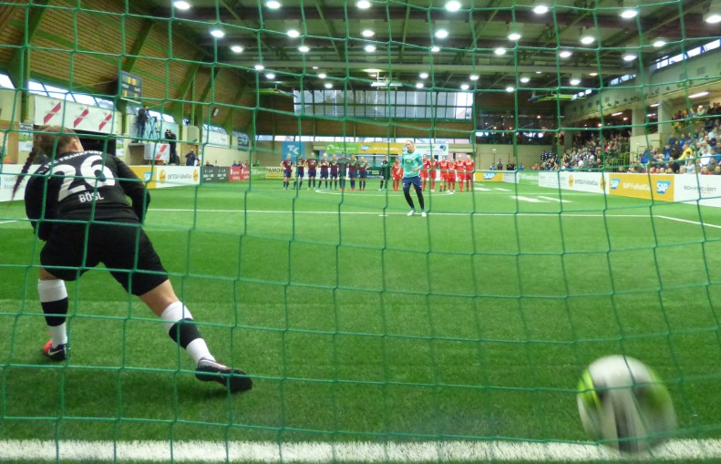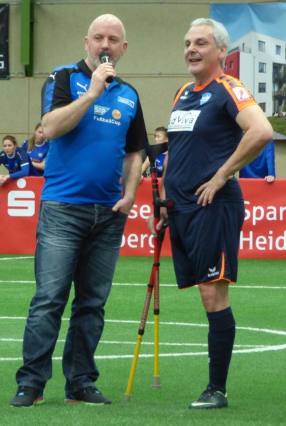 gegenüber Hallensprecher Wolfgang Hell, der sich später auf einem Bein und Krücken im Neunmeterschießen versuchte, dass sein amputiertes Bein eigentlich das stärkere gewesen sei.