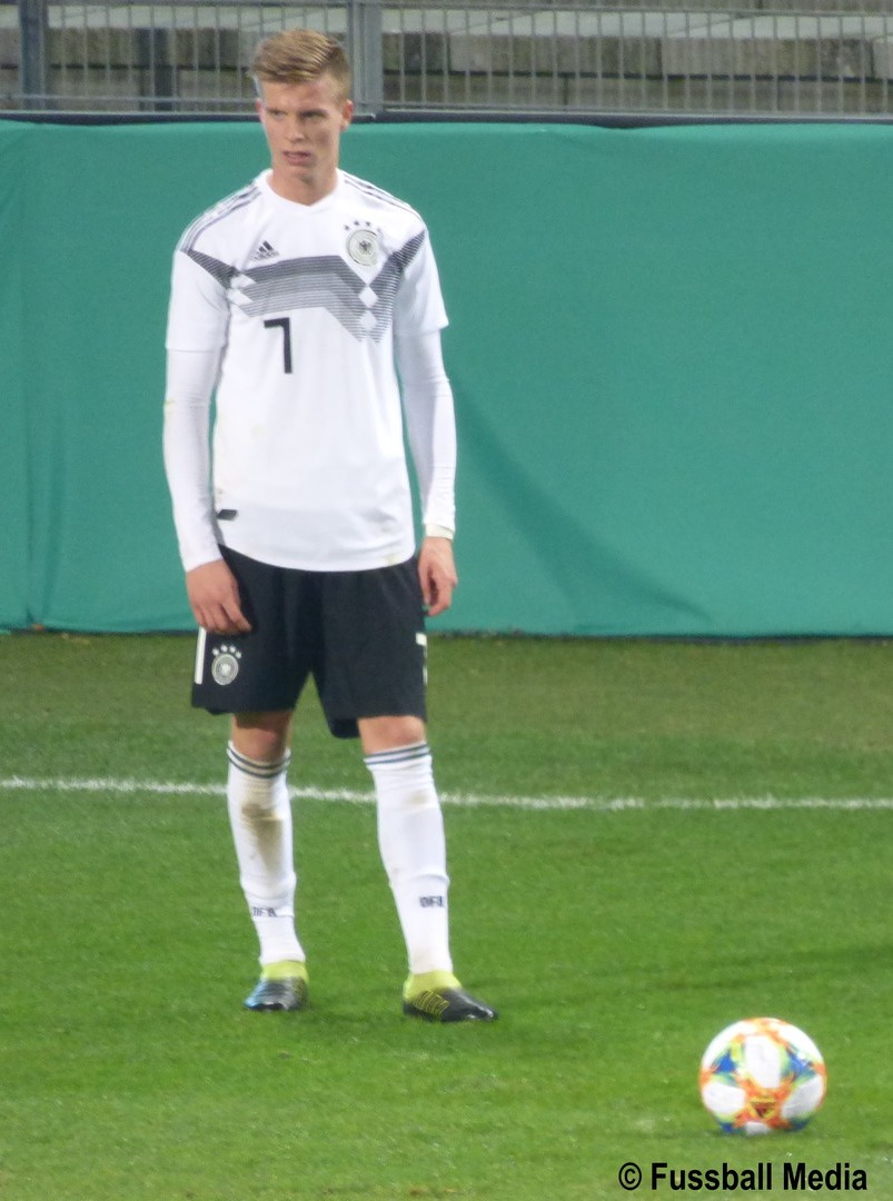 Die Gäste versuchten es in der Folge mit einem sehenswerten Spielaufbau im Mittelfeld. Felipe Soares leitete den Ball mit der Hacke weiter und so wurde Mesaque Dji durch einen Steilpass in Szene gesetzt. Der Spieler von West Ham United zog in die Mitte und schoss, doch Schubert hatte die Hände schnell oben und das runde Leder im Nachfassen sicher (39.). Um ein Haar hätte Vitaly Janelt in das eigene Tor getroffen, doch nach dem missglückten Abwehrversuch war ebenfalls Schubert zur Stelle (41.). Kurz vor dem Pausenpfiff kam die deutsche Mannschaft noch zu einem Torschuss, doch diesmal flog der Ball am Tor vorbei (45.). So ging es mit der knappen Führung im Rücken zum Pausentee.